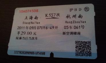 上海南駅から杭州南駅まで、快速列車に乗って移動。
